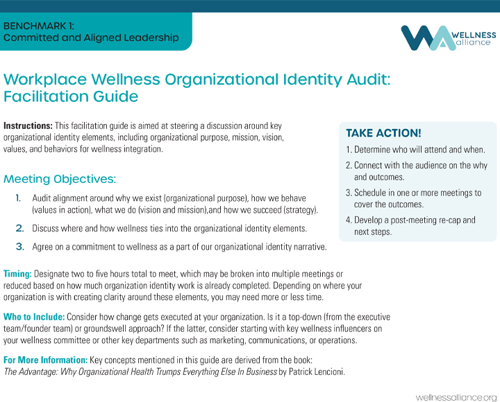 A guided facilitation guide aimed at facilitating a discussion around wellness integration into key organizational identity elements including organizational purpose, mission, vision, values, and behaviors.