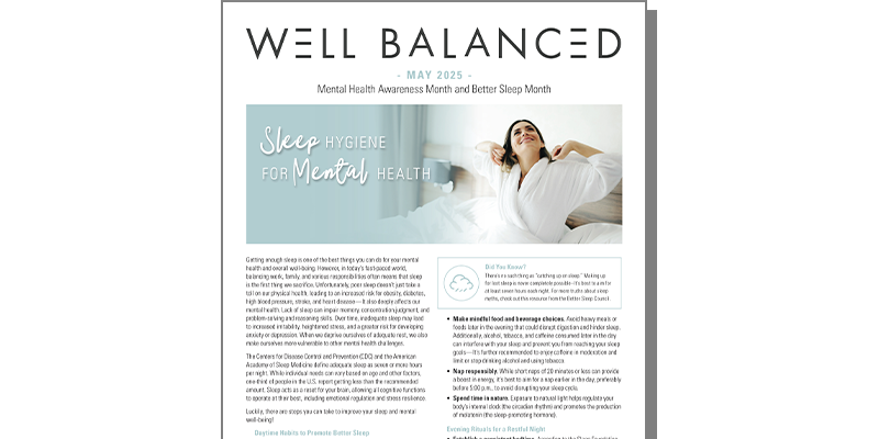 Mental Health Awareness Month and Better Sleep Month Getting enough sleep is one of the best things you can do for your mental health and overall well-being. Well Balanced Toolkit Instructions Member Exclusive: Download any and all of these to customize your communication campaign. Well Balanced Newsletter and One- Page Flier Focused on tips for…